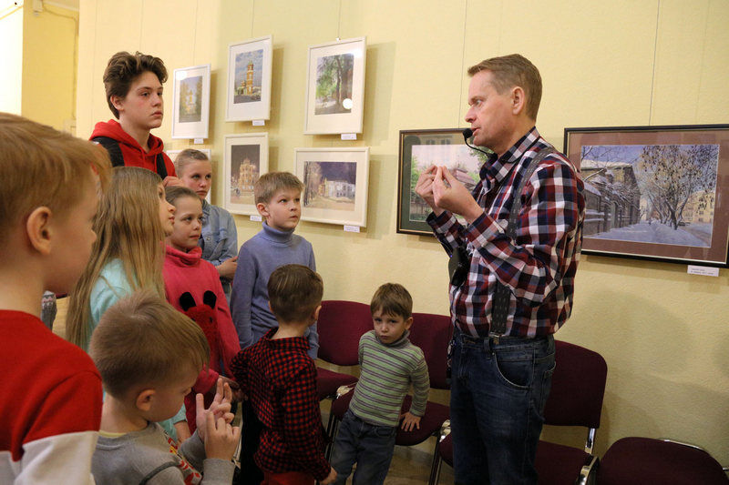Алексей Дедов проводит экскурсию по выставке графики, живописи «В поисках города» Натальи Якушиной